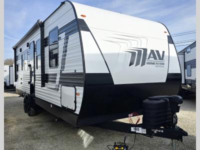 You will love this Momentum MAV toy hauler travel trailer! The front bedroom features a queen bed, and there is plenty of room to walk around. The sliding solid bedroom door helps with space. Overhead storage and a pair of nightstands are convenient storage, plus there is a wardrobe with both drawers and space to hang items. The kitchen offers a microwave, stainless steel sink, and an 8 cu. ft. 12V refrigerator. In the garage, you'll find rollover sofas with a table and a top bed for guests to sleep on. The ramp door/patio will provide additional living space once your toys are unloaded, and the pull down screen will keep bugs out!