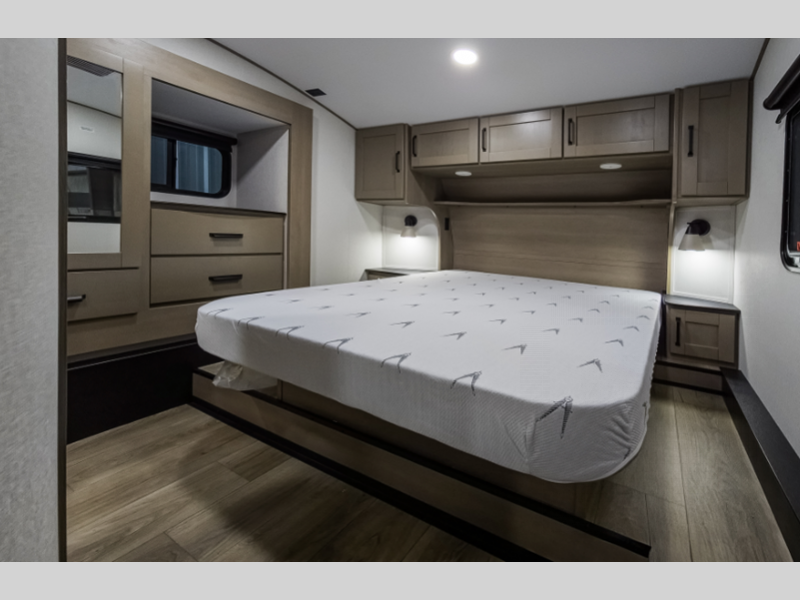 Sleeps 5 Slides 3 Length 32 ft 10 in Ext Width 8 ft Ext Height 12 ft 3 in Hitch Weight 1985 lbs GVWR 11995 lbs Dry Weight 10325 lbs Fresh Water Capacity 74 gals Grey Water Capacity 87 gals Black Water Capacity 47 gals Tire Size ST235/80R16RLE Furnace BTU 35000 btu Available Beds Queen Refrigerator Type 12V Refrigerator Size 16 cu ft Cooktop Burners 3 Shower Size 30" x 34" Number of Awnings 2 LP Tank Capacity 30 lbs Water Heater Type On Demand Tankless AC BTU 15000 btu TV Info LR 40" TV Awning Info 13' & 10'6" One-Touch Electric LED Axle Count 2 Number of LP Tanks 2 Shower Type Radius Electrical Service 50 amp Solar Wattage 370 watts Similar Floorplans