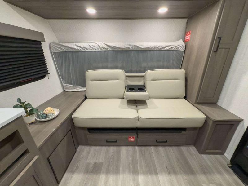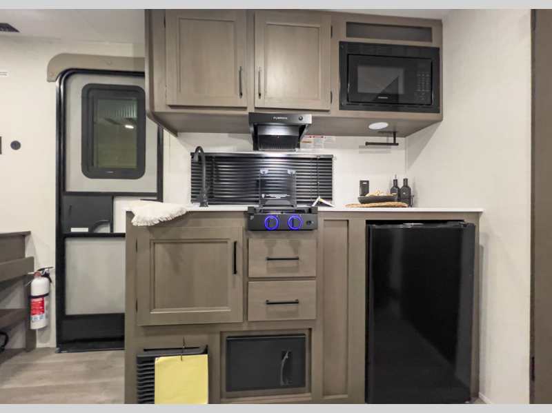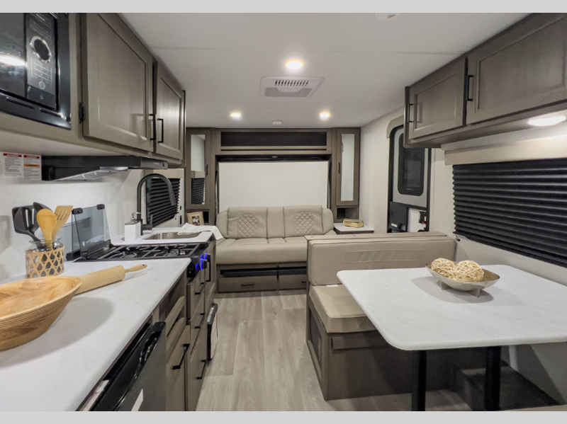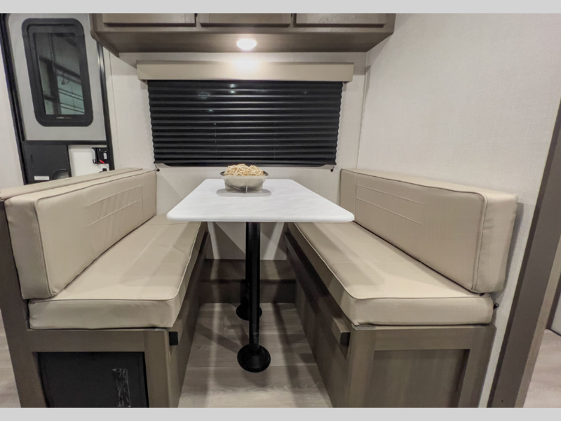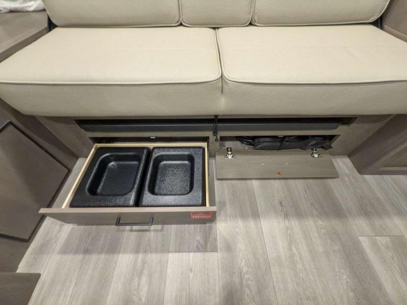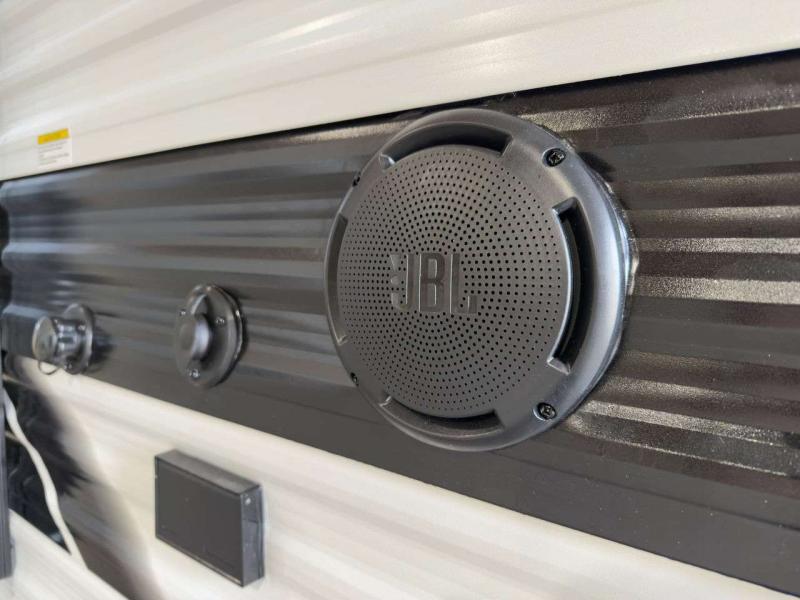 Each model is constructed to a superior standard with an insulated floor and enclosed underbelly plus residential insulated walls that will help with temperature regulation and moisture control. The 6' 6" interior height, tinted windows, and residential cabinet doors will make your space feel a little more like home, and the black automotive glass entry door is ultra sleek. You will find a power awning with a Fusion light outside, along with magnetic storage door catches, a Leash Link/bottle opener, and more convenient features!