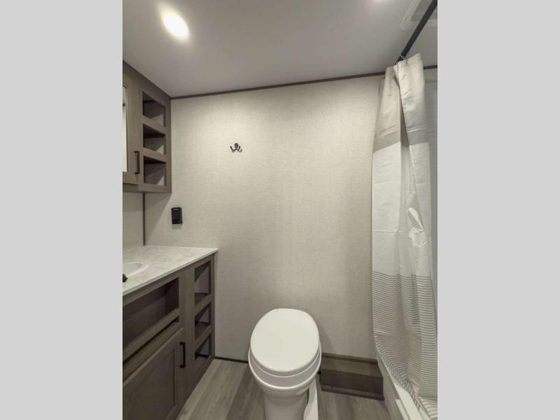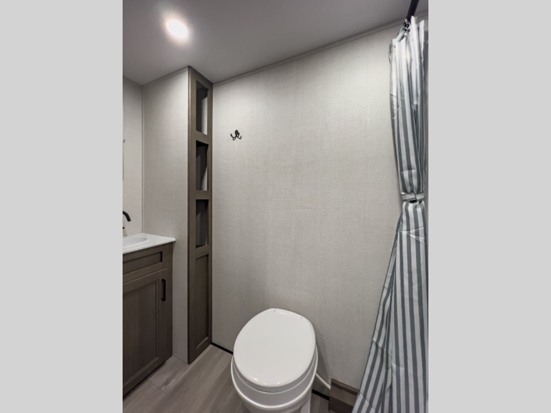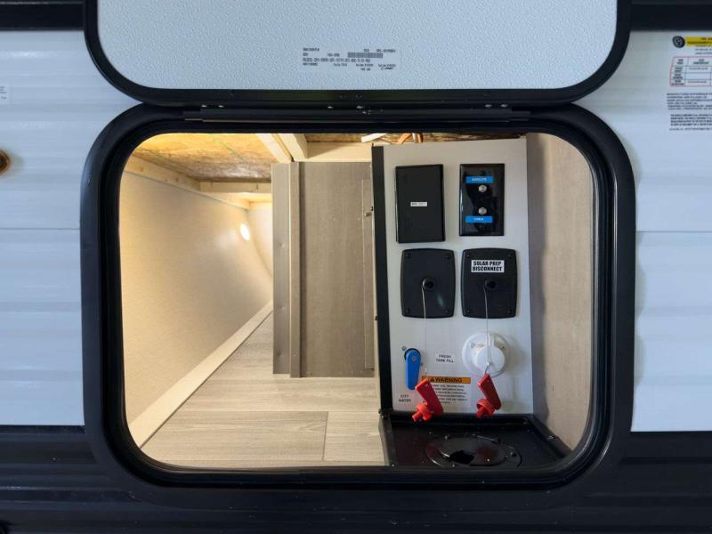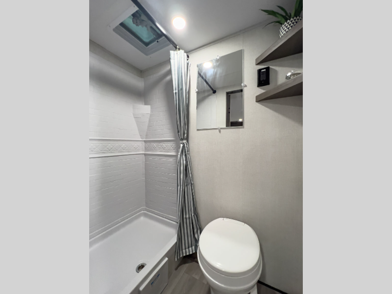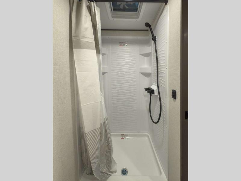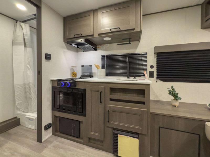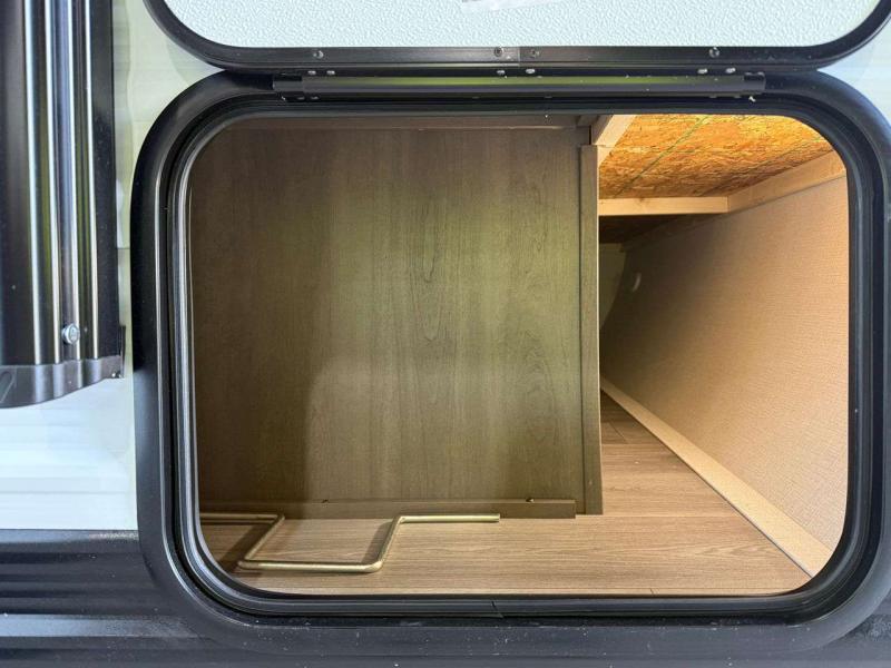 Each model is constructed to a superior standard with an insulated floor and enclosed underbelly plus residential insulated walls that will help with temperature regulation and moisture control. The 6' 6" interior height, tinted windows, and residential cabinet doors will make your space feel a little more like home, and the black automotive glass entry door is ultra sleek. You will find a power awning with a Fusion light outside, along with magnetic storage door catches, a Leash Link/bottle opener, and more convenient features!