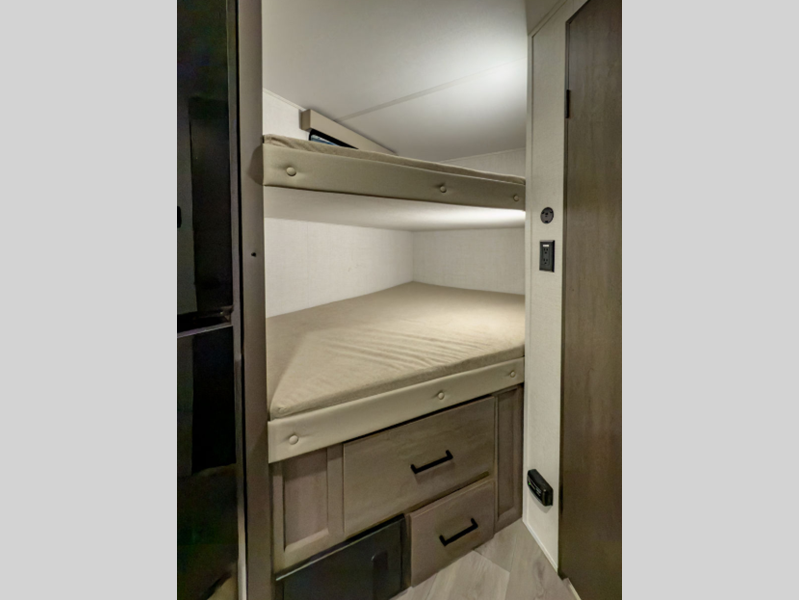 Sleeps 7 Slides 1 Length 23 ft Ext Width 8 ft Ext Height 10 ft 6 in Int Height 6 ft 6 in Hitch Weight 524 lbs GVWR 5500 lbs Dry Weight 4784 lbs Fresh Water Capacity 37 gals Grey Water Capacity 74 gals Black Water Capacity 37 gals Tire Size ST225/75R15LRE Furnace BTU 20000 btu Number Of Bunks 2 Available Beds Queen Murphy Bed Refrigerator Type Glass Front 12V Refrigerator Size 10 cu ft Cooktop Burners 2 Shower Size 27" x 36" Number of Awnings 1 LP Tank Capacity 20 lbs Water Heater Capacity 6 gal Water Heater Type Gas/Electric AC BTU 13500 btu Awning Info 16' Power w/Fusion Light Axle Count 1 Number of LP Tanks 1 Shower Type Walk-In Shower Similar Floorplans