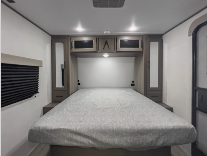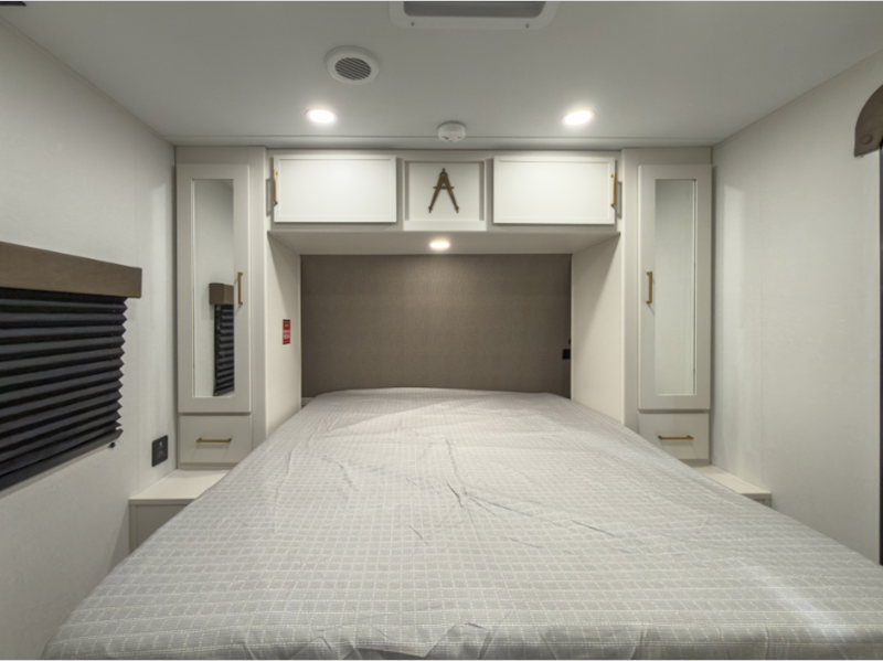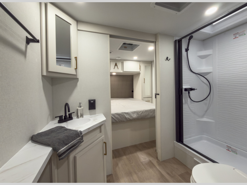 Sleeps 2 Slides 1 Length 33 ft 11 in Ext Width 8 ft Ext Height 11 ft Int Height 6 ft 6 in Hitch Weight 720 lbs GVWR 8800 lbs Dry Weight 7166 lbs Fresh Water Capacity 56 gals Grey Water Capacity 78 gals Black Water Capacity 39 gals Tire Size ST225/75R15LRE Furnace BTU 35000 btu Available Beds Queen Refrigerator Type 12V French Door Refrigerator Size 10.7 cu ft Convection Cooking Yes Cooktop Burners 3 Number of Awnings 1 LP Tank Capacity 20 lbs Water Heater Type Furrion Tankless AC BTU 15000 btu Cargo Deck Size 0 ft TV Info LR 32" TV Awning Info 17' Power w/LED Light Axle Count 2 Washer/Dryer Available Yes Number of LP Tanks 2 Shower Type Walk-In Shower Electrical Service 50 amp Solar Wattage 200 watts Similar Floorplans