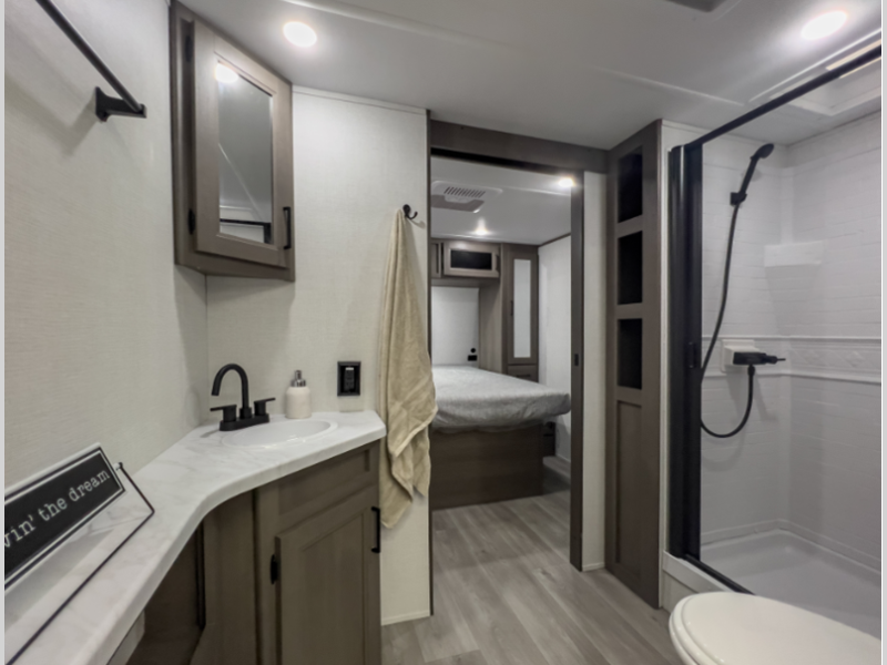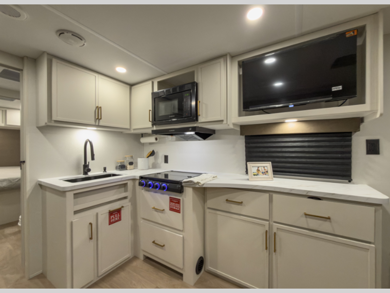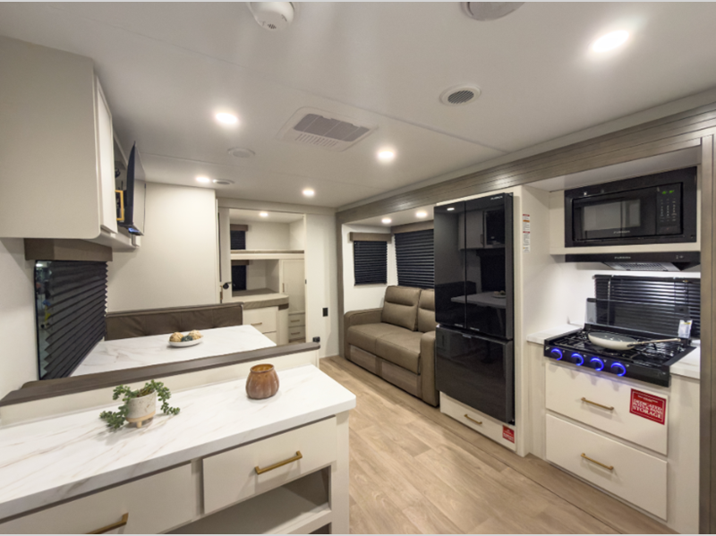 The 4-Season Protection Package includes a heated and enclosed underbelly with suspended tanks, a 35k BTU furnace, EvenFlow ductless heating throughout, and more features that help extend your camping season. There is a 6' 6" interior height to give you plenty of head room, and the thermoformed and seamless countertops in the kitchen will be easy to keep clean. You will also find many exterior conveniences, such as a universal docking station, a bottle opener and Leash Link for you furry friends, and a power tongue jack so you can easily hitch up when you're ready to go home.