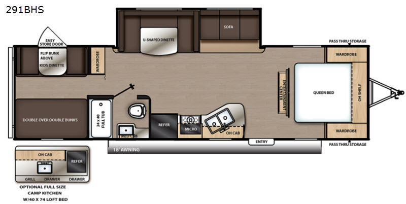 Camping just got a lot more fun with this bunkhouse model which provides your kiddos their own space at night including a kids dinette to play games at. You can enjoy your own private room on the opposite side as you fall asleep on a queen bed. Each morning everyone can meet in the middle to make breakfast and dine at the U-shaped dinette or sit on the sofa with cupholders. You might like to add the optional exterior full size camp kitchen to give you more options and space to prepare and cook meals. You will find that the easy store door allows you to load more items through the exterior to the interior, and the exterior pass-through compartment keeps your outdoor gear away from the inside items under your bed.